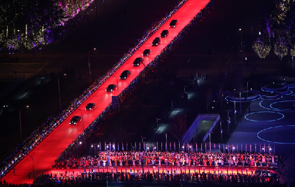 18時許,貴賓的車隊依次駛過鐳射燈照射鋪就的紅地毯,被迎領到水立方。歡迎人群載歌載舞,氣氛熱烈友好。
