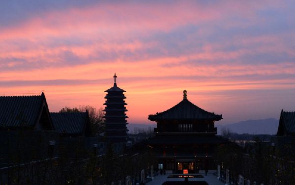 清晨6時40分許,朝霞映紅了北京懷柔雁棲湖東方的天空。