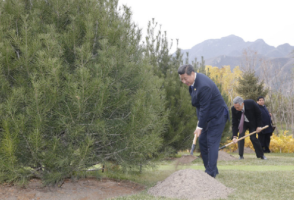 11時40分許,習主席與各成員經(jīng)濟體領導人或代表前往植樹。習主席在開幕辭中希望,亞太經(jīng)濟體以北京雁棲湖為新的起點,引領世界經(jīng)濟的雁陣,飛向更加蔚藍而遼闊的天空。