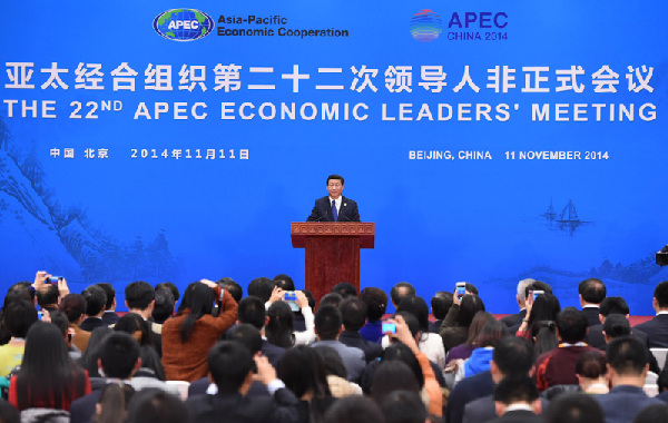 16時許,APEC領導人非正式會議圓滿結束后,習主席出席記者會并講話。