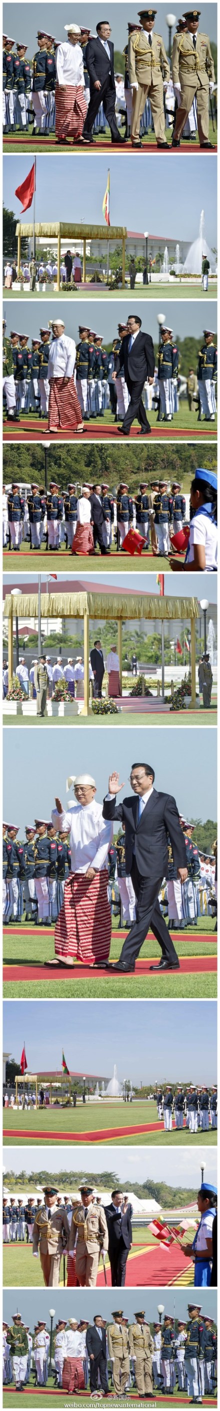 ??? 新華網(wǎng)北京11月14日電 據(jù)新華社“新國際”微博報道,緬甸總統(tǒng)吳登盛14日在內(nèi)比都總統(tǒng)府前廣場舉行隆重儀式,歡迎中國國務院總理李克強對緬甸進行正式訪問。這是李克強就任總理以來首次訪問緬甸。