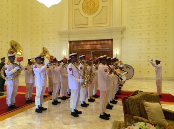 11月14日,緬方軍樂(lè)隊(duì)在為李克強(qiáng)總理舉行的歡迎午宴上奏響兩國(guó)國(guó)歌。
