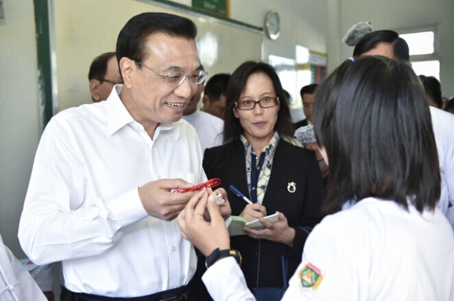 11月14日,克強(qiáng)總理來(lái)到內(nèi)比都第十四中學(xué)與青少年們交流。