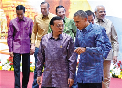 11月12日,李克強(qiáng)與奧巴馬在東亞峰會期間交談。