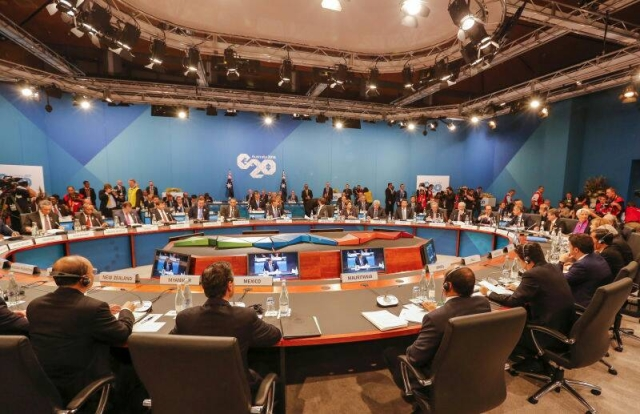 ????(圖為2014年11月15日,二十國(guó)集團(tuán)領(lǐng)導(dǎo)人第九次峰會(huì)在澳大利亞布里斯班舉行。國(guó)家主席習(xí)近平出席會(huì)議并發(fā)表題為《推動(dòng)創(chuàng)新發(fā)展 實(shí)現(xiàn)聯(lián)動(dòng)增長(zhǎng)》的重要講話。新華社發(fā))