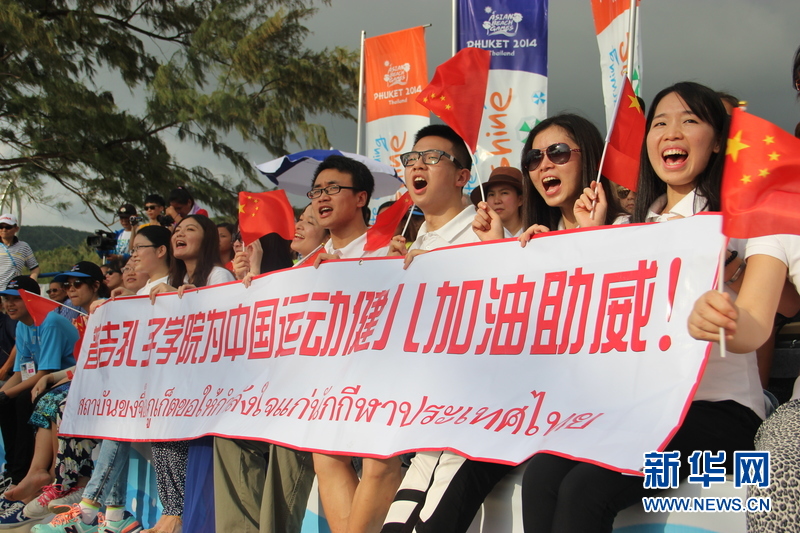 ??? 11月16日,普吉孔子學院的中國志愿者老師們?yōu)橹袊\動健兒加油。中國體育代表團16日在泰國普吉舉行的第四屆亞洲沙灘運動會上勇奪2枚金牌和2枚銅牌。當天比賽全部結(jié)束時,中國隊以3金2銀5銅的成績暫列獎牌榜第五,東道主泰國隊以9金11銀12銅的成績暫列金牌榜和獎牌榜第一。新華社記者楊云燕攝