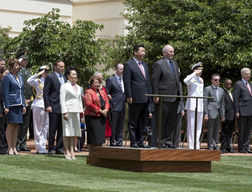 ??? 11月17日,澳大利亞總督科斯格羅夫在總督府草坪為習(xí)近平舉行隆重歡迎儀式。習(xí)近平和夫人彭麗媛抵達時,受到科斯格羅夫總督夫婦熱情迎接。新華社記者李學(xué)仁攝