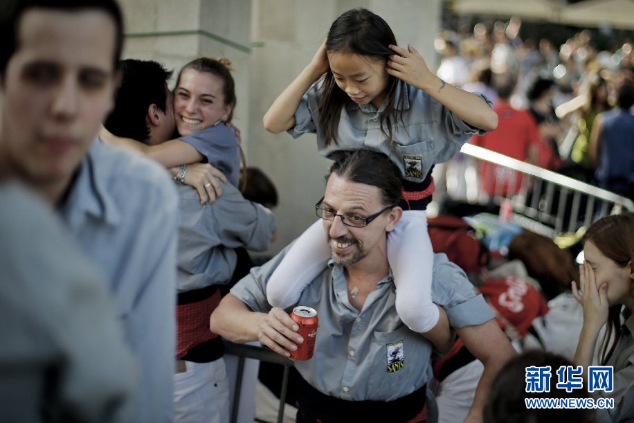 ????Jana騎在養(yǎng)父的肩膀上來到表演現(xiàn)場,兩人一起準(zhǔn)備參加一場在巴塞羅那進(jìn)行的表演。新華社巴塞羅那分社攝影師Pau Barrena 攝
