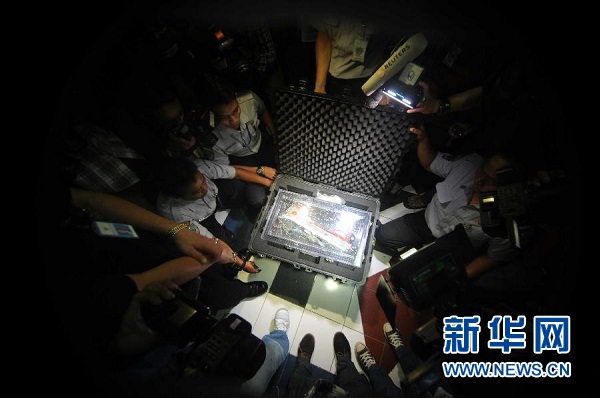??? 1月12日,在印度尼西亞雅加達,工作人員打開裝有亞航失事客機黑匣子的箱子。印度尼西亞國家交通安全委員會主席塔唐·庫爾尼亞迪12日說,搜救人員當(dāng)天早上打撈起的失事亞航客機其中一個黑匣子——飛行數(shù)據(jù)記錄器狀態(tài)良好。新華社發(fā)(阿貢攝)