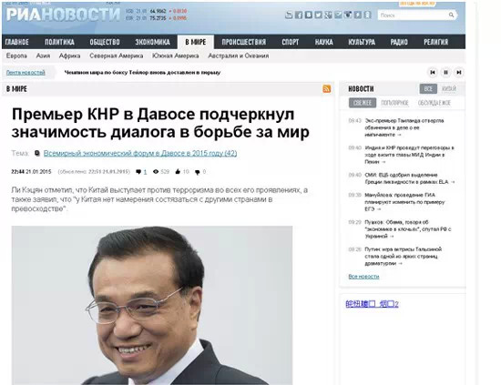 俄新社21日以《中國總理強調(diào)以對話促進和平的重要性》為題報道了李克強總理在達沃斯論壇上的致辭。報道中援引了李克強“世界各國都要像愛護自己的眼睛一樣愛護和平”的說法,并指出,中國反對一切形式的恐怖主義。文章寫道,今年是世界反法西斯戰(zhàn)爭勝利70周年,李克強強調(diào)了維護戰(zhàn)后國際秩序的重要性。