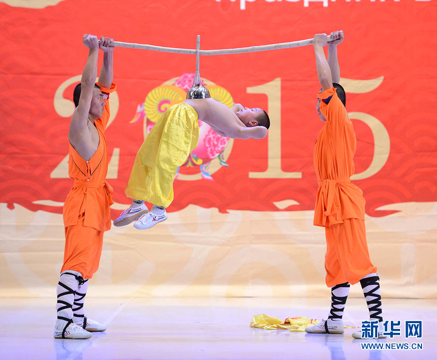 2月4日晚,在烏茲別克斯坦首都塔什干突厥宮,藝術(shù)家在表演中國(guó)武術(shù)和舞蹈。新華網(wǎng)記者 沙達(dá)提 攝