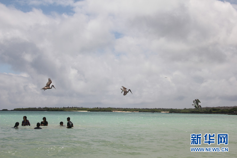 加拉帕戈斯群島中部的圣克魯斯(Santa Cruz)島上,數(shù)只鵜鶘在捕食,人們?cè)谒墟覒?,相處和諧。