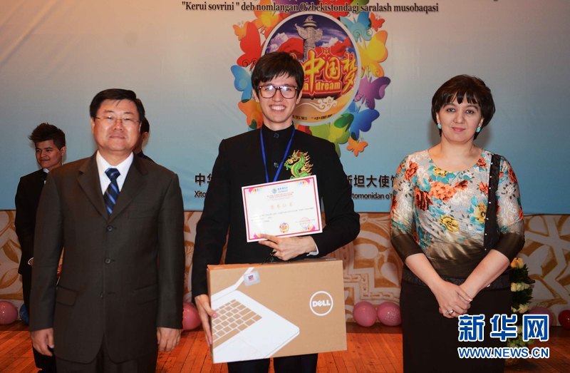 4月28日,在烏內(nèi)務(wù)部文化宮禮堂,來自撒馬爾罕國立外國語學(xué)院的扎爾卡毛(中文名:康曉鑫)獲得特等獎。新華網(wǎng)記者 沙達(dá)提攝