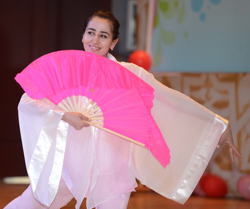4月28日,在烏內(nèi)務(wù)部文化宮禮堂活動現(xiàn)場,撒馬爾罕外國語學(xué)院的UGILOY(中文名:雅靜)在參加比賽。新華網(wǎng)記者 沙達(dá)提攝