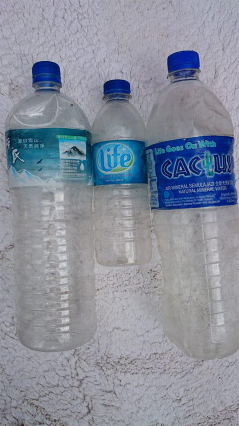 圖為當?shù)芈蓭煱l(fā)現(xiàn)的三個礦泉水瓶,其中一個標有中文字樣