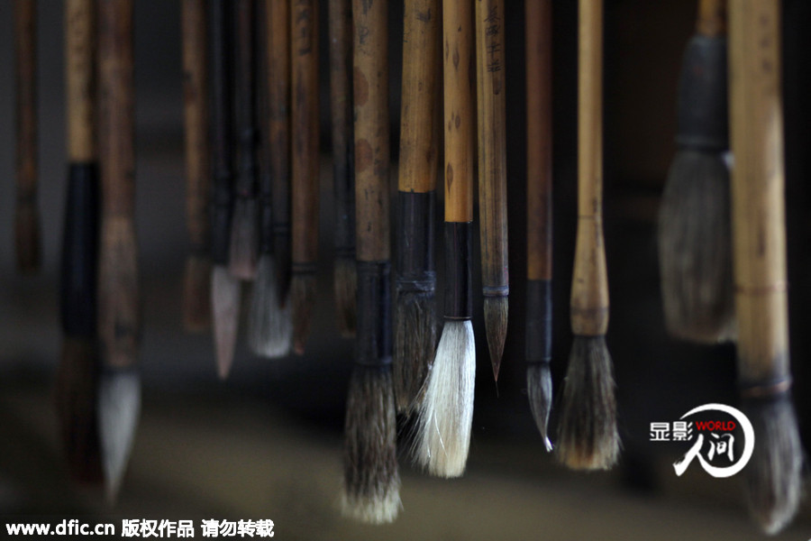 2015年2月24日,中國江蘇南京的一間公寓里,王錚(音譯)父親使用的毛筆懸掛在那里蒙上一層灰很久沒人使用。他的父親在馬航MH370事件中失聯(lián)無消息。