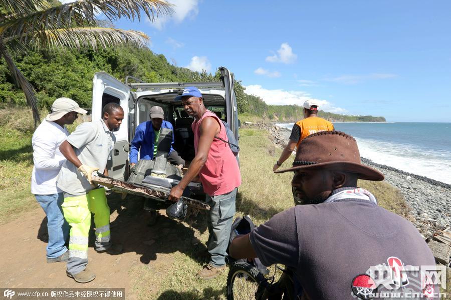 當(dāng)?shù)貢r間2015年8月11日,法屬留尼汪島,當(dāng)?shù)厮丫汝牜@得的馬航MH370殘骸。
