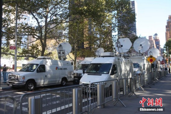 當(dāng)?shù)貢r(shí)間9月24日,電視媒體轉(zhuǎn)播車(chē)在紐約聯(lián)合國(guó)總部外云集。聯(lián)合國(guó)發(fā)展峰會(huì)將于25日至27日舉行,150余位世界各國(guó)領(lǐng)導(dǎo)人將出席本次峰會(huì)。 中新社記者 鄧敏 攝