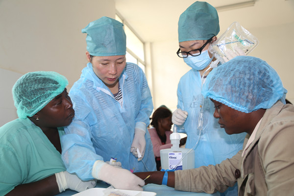 2014年12月10日,解放軍援塞醫(yī)療隊為中塞友好醫(yī)院由留觀中心轉(zhuǎn)型為留觀診療中心開展輸液培訓(xùn)活動。這是中方隊員在教授塞方護(hù)理人員留置針的穿刺方法。 新華社發(fā)(戴欣 攝)