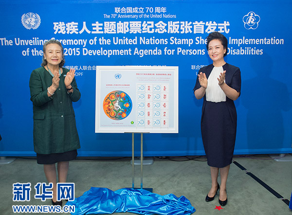 新華網(wǎng)聯(lián)合國9月27日電(記者霍小光)當(dāng)?shù)貢r(shí)間27日上午,國家主席習(xí)近平夫人彭麗媛在紐約出席殘疾人主題郵票紀(jì)念版張首發(fā)式。彭麗媛同聯(lián)合國秘書長潘基文夫人柳淳澤一道為紀(jì)念版張揭幕。