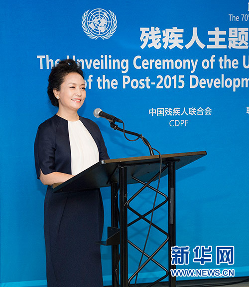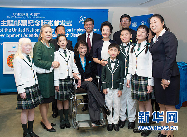 9月27日,國家主席習(xí)近平夫人彭麗媛在紐約出席殘疾人主題郵票紀(jì)念版張首發(fā)式。 新華社記者王曄攝