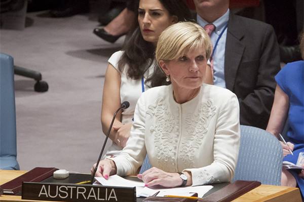 ↑2015年7月29日,在位于美國紐約的聯(lián)合國總部,澳大利亞外交部長畢曉普(前)在安理會(huì)上發(fā)言。