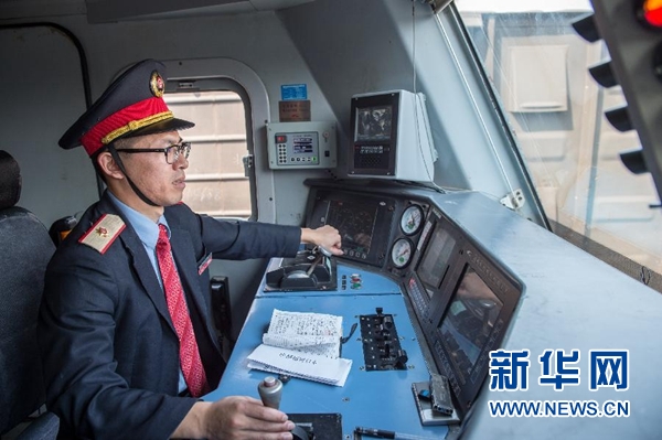 10月15日,第1000列中歐班列開(kāi)行前,重慶機(jī)務(wù)段執(zhí)行本次班列駕駛?cè)蝿?wù)的司機(jī)王銘杰在駕駛室內(nèi)進(jìn)行開(kāi)行前的操作。當(dāng)日11時(shí)45分,載著筆記本電腦等51個(gè)集裝箱貨物的中歐班列,緩緩駛出重慶團(tuán)結(jié)村站,駛向1.1萬(wàn)公里之外的德國(guó)杜伊斯堡。這是第1000列往來(lái)中國(guó)和歐洲之間的國(guó)際貨運(yùn)列車(chē)。新華社記者劉潺攝