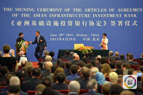 ????2015年6月29日,《亞洲基礎(chǔ)設(shè)施投資銀行協(xié)定》簽署儀式在北京舉行。當日,英國授權(quán)代表(臺上中)在簽署《協(xié)定》后與儀式主持、財政部副部長史耀斌握手。