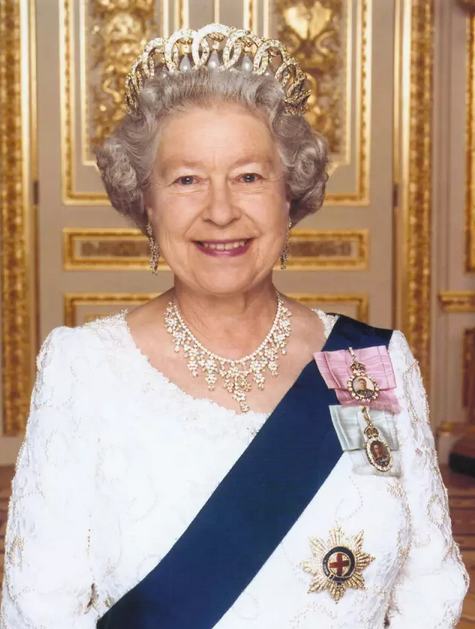 女王的徽章由黃色緞帶、女王年輕時(shí)的畫像和一頂用紅色琺瑯裝飾的都鐸皇冠組成。
