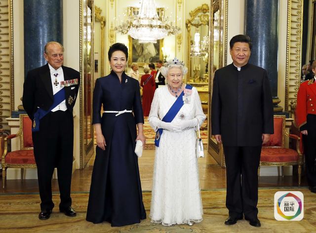 國家主席習(xí)近平和夫人彭麗媛在倫敦白金漢宮出席英國女王伊麗莎白二世舉行的歡迎晚宴。(鞠鵬攝)