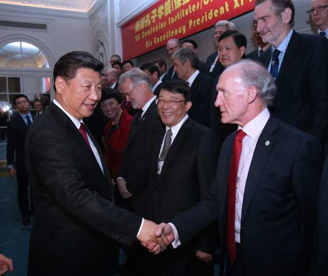 習近平指出,近年來,孔子學院在英國快速發(fā)展。目前,英國已經(jīng)建立起29所孔子學院和126個孔子課堂,數(shù)量居歐洲之首。全英孔子學院取得的碩果也是中英人文交流蓬勃發(fā)展的縮影。通過人文交流,中英兩國文化中的精華正在對兩國人民的思維方式和生活方式產(chǎn)生著奇妙的“化學反應”?!盀橹粎挘d人不倦。”希望在座各位教師再接再厲,為中英友好事業(yè)添磚加瓦。希望孔子學院繼續(xù)秉承“相互尊重、友好協(xié)商、平等互利”的校訓,為傳播文化、溝通心靈、促進世界文明多樣性作出新的更大貢獻。