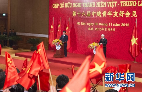 習近平和阮富仲共同步入會見廳,受到中越兩國共青團中央負責人和各界青年代表的熱情迎接,軍樂隊奏響歡快的迎賓曲,中越兩國青年齊聲合唱歌曲《越南-中國》。習近平和阮富仲同青年代表合影并親切交流。