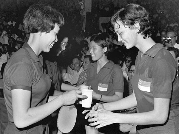 1972年7月8日至7月15日,中國(guó)乒乓球代表團(tuán)應(yīng)邀對(duì)新加坡進(jìn)行友好訪問。訪問期間,中、新兩國(guó)運(yùn)動(dòng)員通過友好比賽,相互學(xué)習(xí),交流經(jīng)驗(yàn),增進(jìn)了友誼。圖為中、新兩國(guó)乒乓球運(yùn)動(dòng)員在比賽場(chǎng)上。