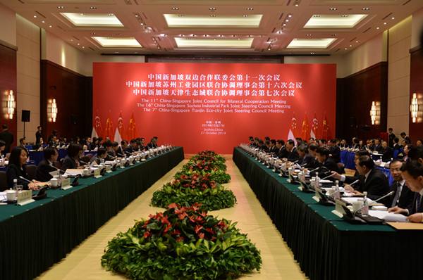 圖為10月27日拍攝的中新三個(gè)高層合作機(jī)制會(huì)議現(xiàn)場(chǎng)。2014年10月27日,中國(guó)新加坡雙邊合作聯(lián)委會(huì)第十一次會(huì)議、中國(guó)新加坡蘇州工業(yè)園區(qū)聯(lián)合協(xié)調(diào)理事會(huì)第十六次會(huì)議和中國(guó)新加坡天津生態(tài)城聯(lián)合協(xié)調(diào)理事會(huì)第七次會(huì)議在蘇州舉行。