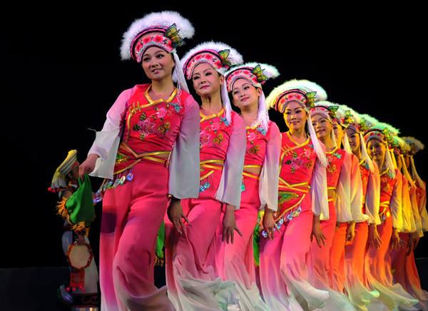 2014年1月,云南“滇韻彩云南”演出團(tuán)春節(jié)赴新加坡演出。圖為演員在排演景頗族歌舞《目瑙縱歌》。