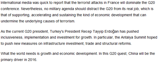二十國集團領(lǐng)導(dǎo)人第十次峰會于15日下午在土耳其安塔利亞舉行第一階段會議。在二十國集團的不斷探索與實踐中,中國無疑將成為2016年世界經(jīng)濟的主要驅(qū)動力。