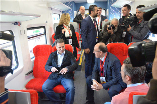 當(dāng)天,馬其頓鐵路運(yùn)輸公司為其從中國中車集團(tuán)株洲電力機(jī)車有限公司采購的首列電力動(dòng)車組舉行試運(yùn)行儀式。格魯埃夫斯基等多名馬其頓政府高官、馬鐵路運(yùn)輸公司總經(jīng)理科斯托夫、中國駐馬其頓大使溫振順應(yīng)邀出席儀式并試乘動(dòng)車組。