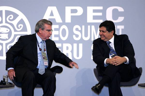 2008年11月21日,秘魯總統(tǒng)加西亞(右)與APEC工商領導人峰會主席莫拉萊斯在開幕式上交談。