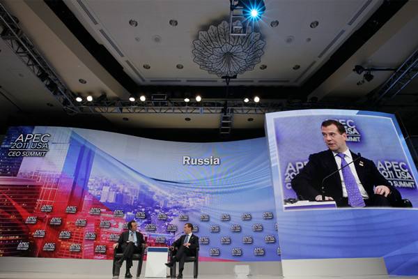 2011年11月13日,俄羅斯總統(tǒng)梅德韋杰夫出席在美國夏威夷州首府檀香山舉行的APEC工商領導人峰會。