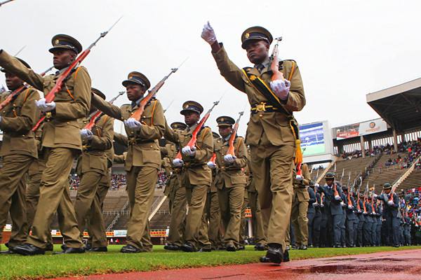 2015年4月18日,在中國援建的津巴布韋國家體育場內,津國防軍進行表演。(新華社發(fā),費列蒙攝)