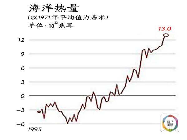 據(jù)美國(guó)獨(dú)立機(jī)構(gòu)氣候總站統(tǒng)計(jì),從1880年到2014年,海洋表面溫度每10年平均升高0.1華氏度。如果按照海洋儲(chǔ)存熱量的變化來(lái)看,以10的22次方焦耳為單位、1971年為基準(zhǔn),1955年海洋儲(chǔ)存熱量在負(fù)3個(gè)單位以下,2014年則超過(guò)13個(gè)單位。