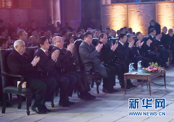 1月21日,國(guó)家主席習(xí)近平和埃及總統(tǒng)塞西在古老的盧克索神廟廣場(chǎng)共同出席中埃建交60周年慶?;顒?dòng)暨2016中埃文化年開幕式。新華社記者張鐸攝