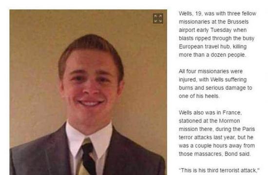 臺(tái)灣中時(shí)電子報(bào)3月23日援引《紐約每日新聞》的報(bào)道稱,19歲的美國青年威爾斯(Mason Wells)是一名傳教士,他在22日和另外三位同伴在布魯塞爾機(jī)場(chǎng)遇到了恐襲,所有人都受了傷,威爾斯身上除了燒燙傷外,腳也受到嚴(yán)重傷害。