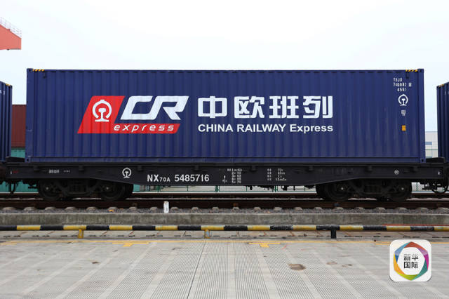 2016年6月8日,采用統(tǒng)一品牌標(biāo)識的中歐班列準(zhǔn)備從浙江義烏火車西站開出。(新華社發(fā),周建國攝)