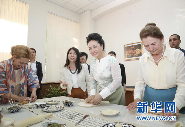 當?shù)貢r間6月22日下午,國家主席習(xí)近平夫人彭麗媛同烏茲別克斯坦總統(tǒng)卡里莫夫夫人卡里莫娃共同參觀塔什干孔子學(xué)院。這是彭麗媛向?qū)W生們示范包餃子。新華社記者丁林攝
