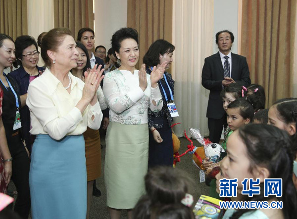 當?shù)貢r間6月22日下午,國家主席習(xí)近平夫人彭麗媛同烏茲別克斯坦總統(tǒng)卡里莫夫夫人卡里莫娃共同參觀塔什干孔子學(xué)院。這是彭麗媛和卡里莫娃為參加演出的學(xué)生鼓掌。新華社記者丁林攝