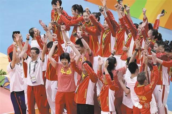 (中國女排在里約奧運會頒獎儀式后慶祝。新華社記者王鵬 攝)