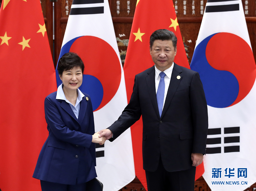 9月5日,國(guó)家主席習(xí)近平在杭州會(huì)見(jiàn)來(lái)華出席二十國(guó)集團(tuán)領(lǐng)導(dǎo)人峰會(huì)的韓國(guó)總統(tǒng)樸槿惠。 新華社記者張鐸攝