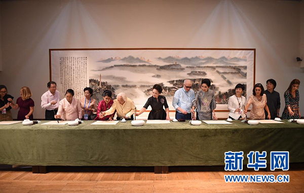 9月5日,國(guó)家主席習(xí)近平夫人彭麗媛邀請(qǐng)出席二十國(guó)集團(tuán)領(lǐng)導(dǎo)人杭州峰會(huì)外方代表團(tuán)團(tuán)長(zhǎng)夫人參觀中國(guó)美術(shù)學(xué)院。這是彭麗媛與來(lái)賓一同書(shū)寫(xiě)漢字“和”。新華社記者 謝環(huán)馳 攝