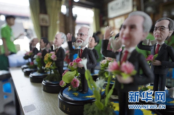 9月1日,手工藝人吳小莉創(chuàng)作的捏塑作品G20杭州峰會(huì)參會(huì)領(lǐng)導(dǎo)人形象在杭州京杭大運(yùn)河畔的橋西歷史街區(qū)擺放展示。新華社記者 鞠煥宗 攝